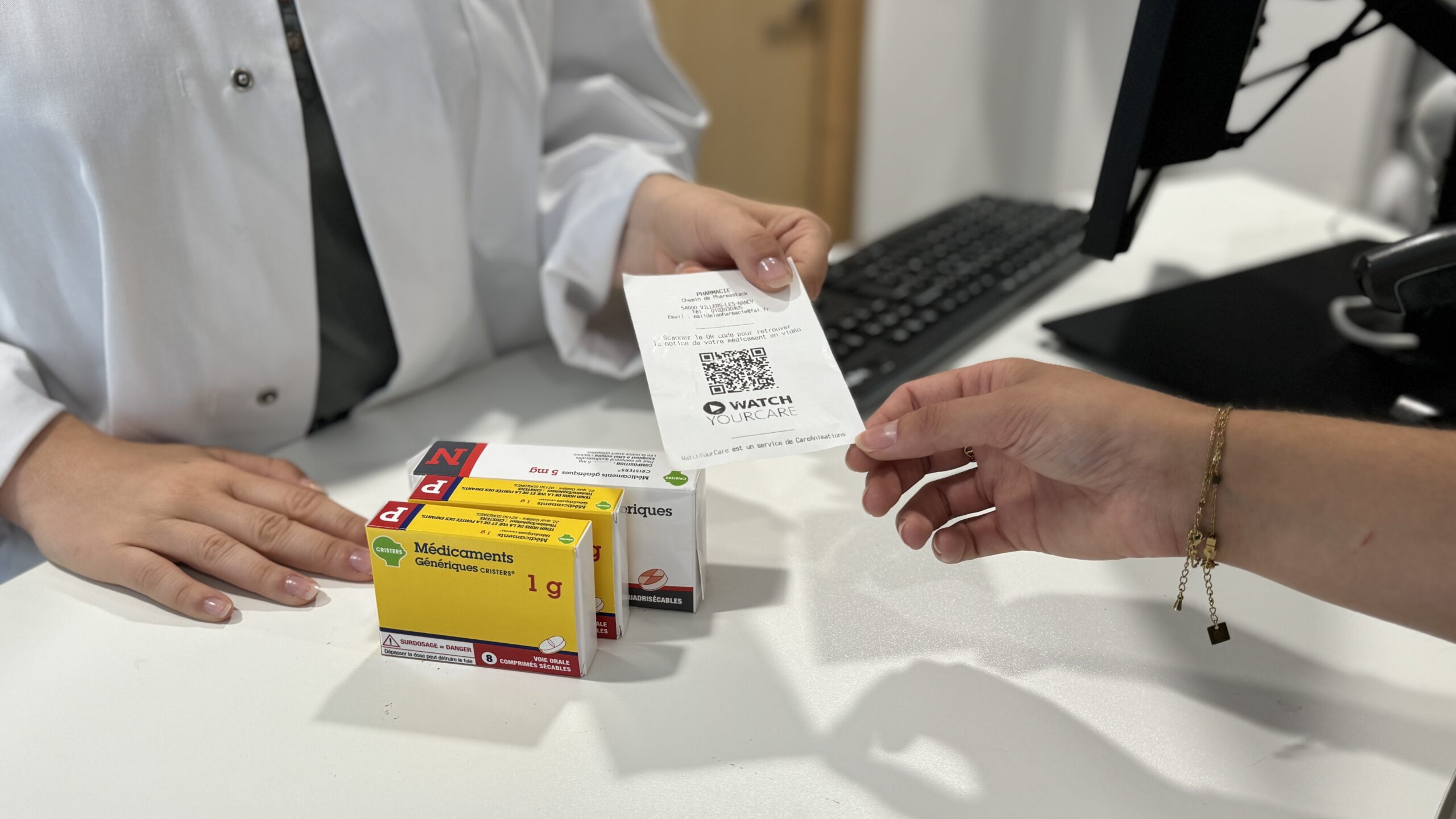 Les pharmaciens peuvent sélectionner et partager ces vidéos en quelques clics, soit par email, soit en imprimant un ticket de caisse contenant un QR code unique. Cela permet aux patients d’accéder facilement aux informations, où et quand ils le souhaitent, sans besoin de créer un compte.